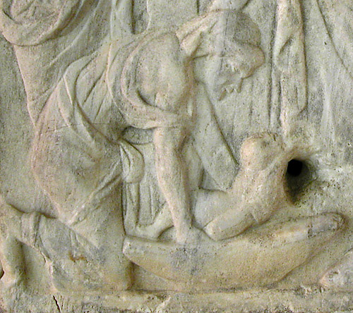 Nurse with Medea's children Sabina was a slave during the 1st century CE in the prominent household of Servius Cornelius Dolabella Petronianus, a senator and co-consul with the Emperor Domitian in 86 CE. Sabina was a nutrix to the filiusfamilias, Servius Cornelius Dolabella Metilianus, either because custom dictated that a senatorial family would employ a wet nurse for a newborn child or a surrogate was necessary for his birth mother due to her physical or emotional weakness after labor (see Gellius on breastfeeding, Soranus on nurses) -- it is also possible that Metilianus' delivery resulted in the not uncommon death of his mother Metilia (citizen women's names). Sabina herself would have been lactating after the birth of her own child, whom she may have continued to nurse or lost, given the high mortality rate for Roman children of all classes. Her child’s father was possibly a fellow slave in the elder Dolabella’s household with whom she had some kind of a relationship (see contubernales, as marriage between slaves was not legal). It is not evident what Sabina’s duties were after her charge was old enough to be turned over to a tutor: she may have continued to serve as nutrix for other children in the household or performed general tasks typical of female slaves within a large familia, such as cleaning, weaving, serving in some domestic capacity. Sabina's name, "the Sabine woman," is not a typical slave name (see slave names). Rather than an indication of her birthplace in the Sabine region, her name suggests a link to the gens Metilia, whose paterfamilias was the Roman senator Publius Metilius Sabinus Nepos (consul suffectus in 91 CE). Sabina may have been brought to the Dolabella home as part of her mistress's dowry when Metilia married Petronianus. While her lot was undoubtedly better than that of slaves who served outside the villa, she was still a slave, with little personal freedom or choice in her duties or relationships. At some point in her life Sabina was officially manumitted by her dominus (father or son: see freed names); there is no record of when this occurred, but her manumission may not have required her to leave the Dolabella household. Sabina's dedication was found near the fifth milestone on the Via Ardeatina in the ager Romanus southwest of Rome, suggesting that Metilianus maintained his childhood nurse in his villa suburbana until her death. The epitaph is seen as evidence that their relationship was a continuous and affectionate one. The full formal name of Sabina's nursling, who became consul suffectus in 113 CE, can be found in an honorary inscription (CIL 9.3154) awarded him as patron by the municipium of Corfinium (see also CIL 9.3152). Sabina's epitaph was transcribed from a funerary marker which was lost soon after its discovery and published in 1842 (CIL 6.16450). For further information about nutrices, see Soranus; also, Bradley, Dixon, Laes & Vuolanto, Rawson (1986, 2003) in the Bibliography.