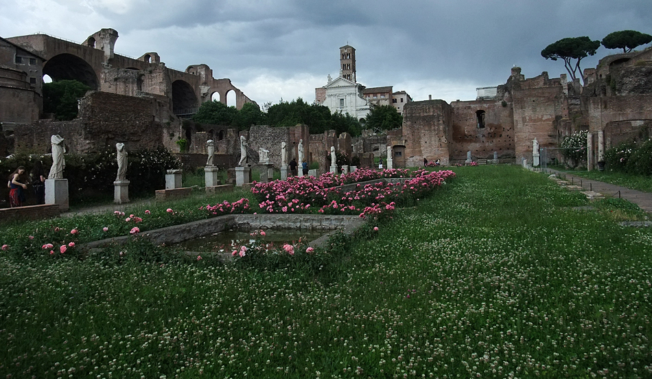 The statues now placed around the perimeter of the open courtyard were discovered in the late nineteenth century, in a pile at the west end of the courtyard, where they had been placed for ultimate destruction by stonecutters and lime makers. Not all the surviving statues of the Virgines Vestales Maximae that once stood in the the Atrium courtyard are to be found there today; some are preserved elsewhere, several are no longer on display anywhere (a notable example is this elegant sculpture once exhibited in the Baths of Diocletian museum). These statues, dating from the early second to the late third century CE, give evidence of aspects of dress attributed to the Vestals, but with no indication of color. In a 1908 article, Deman observes that there are four "insignia of their priestly office" --not all present in every extant statue -- that are proof of Vestal identity: seni crines, infula and vittae, veil, and the suffibulum, a short white veil with a purple border, fastened with a fibula(341). This statue of a Chief Vestal displays her headress covered with the suffibulumthat Vestals may have worn during sacrifices. The Vestal headdress is indeed distinctive: her hair is braided and then wrapped some four to six turns in an infula, a long strand of white and red wool twisted together; at the nape of her neck the infula is attached to vittae, flat white bands whose ends hang forward over the Vestal's shoulders in loops. While their distinctive hairstyle, the seni crines, which they are said to share with brides, set the Vestals apart, extant images of brides and Vestals do not give a clear picture of this arrangement (see a video interpretation). Many statues of the Maxima depict her modestly draped in a voluminous palla, which is sometimes drawn up over her head. She wears a floor-length tunic (some statues reveal on their shoulders the straps of the matronal garment, the stola) that is belted, like the bride's, with a Hercules knot. For an analysis of these statues, see Esther Boise van Deman's article "The Value of the Vestal Statues as Originals" (American Journal of Archaeology (1908) 12.3324-342), and M.M. Lindner (2015), Portraits of the Vestal Virgins in the Bibliography.
